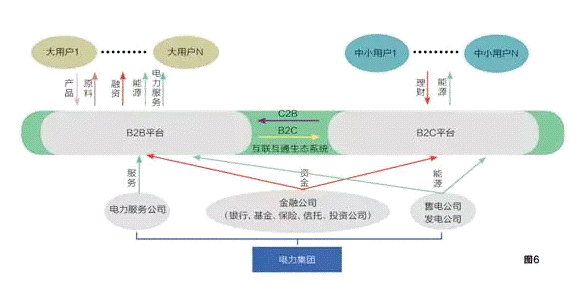 為充分利用互聯網的零距離、零時差的資源共享優勢,在建立中小電力用戶的B2C平臺以及與大用戶之間的B2B平臺后,通過C2B對兩個平臺進行融合,以金融為核心,以供應鏈為紐帶,以能源服務為支持,構建融合多產業的互聯互通生態系統。(見圖6)