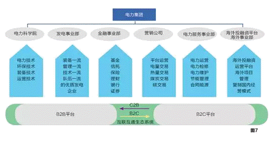 以發電業務為基礎,以金融業務為核心,以電力營銷為龍頭,以電力科研和電力服務為支撐,構建全球化互聯互通生態系統。(見圖7)