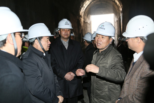 當(dāng)天中午12時,郝鵬省長、馬順清、嚴(yán)金海副省長率領(lǐng)高華秘書長、張文華副秘書長,以及省總工會、省發(fā)改委、省政府辦公廳的有關(guān)負(fù)責(zé)同志,來到引大濟湟工程現(xiàn)場調(diào)研。調(diào)水總干渠是“引大濟湟”的控制性輸水工程。在大坂山北坡的總干渠進(jìn)口,省領(lǐng)導(dǎo)踩著沙礫,走進(jìn)隧洞,詳細(xì)了解工程每天的掘進(jìn)情況。了解到卡機脫困這個長期制約工程進(jìn)度的突出難題得到有效解決,項目建設(shè)正在扎實有序推進(jìn)時,郝鵬十分高興,他指出,一定要加大現(xiàn)場協(xié)調(diào)力度,狠抓施工關(guān)鍵環(huán)節(jié),努力破解技術(shù)難題,盡快實現(xiàn)人工鉆爆和TBM機相結(jié)合的掘進(jìn),在確保工程質(zhì)量和安全的前提下,一米一米地倒排工期,加快工程進(jìn)度,早日將剩余約8千米貫通。隨后,郝鵬省長向青海水電集團駐工地一線代表頒發(fā)了省委省政府春節(jié)慰問金。